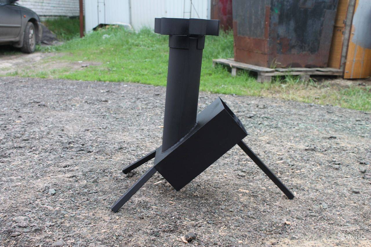 Конструкция любого реактивного отопительного прибора представляет собой простейшую печь-ракету прямого горения. Чаще всего такие агрегаты изготавливают из отрезка трубы большого диаметра, выполняющего одновременно роль топки и дымохода. Тягу в реактивной буржуйке обеспечивает разрежение на её горячем конце, который нередко используется ещё и для приготовления пищи. КПД такой конструкции не идёт ни в какое сравнение с агрегатами, использующими пиролиз, но что касается простоты и компактности, то здесь реактивным отопительным приборам нет равных.