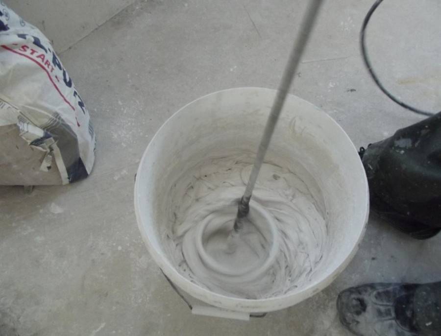 Чтобы замесить смесь, нет необходимости использовать растворомешалку, для приготовления можно воспользоваться обычной дрелью со специальной насадкой или строительным миксером.