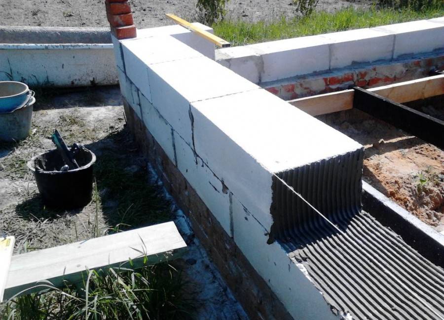 Важно: качество выполнения работ напрямую зависит от того, как будет положен первый ряд.Перед тем, как класть первый ряд блоков, необходимо уложить гидроизолирующий слой. По строительным нормам допускается выступ блоков над цоколем не более чем на 1/3. С помощью нивелира определяется самый высокий угол фундамента
