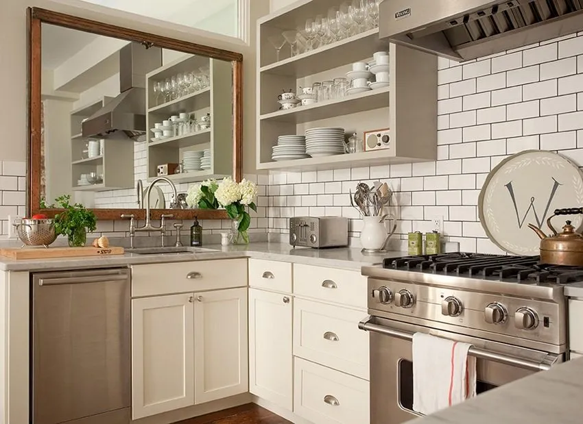 Фартук на кухне оформлен с помощью пластиковых панелей, стилизованных под плитку