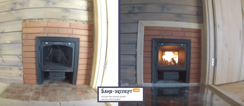 Шаг 4. Берут лист минерита и вырезают в нем отверстие под топку точно по размеру. Во втором листе делают такое же отверстие, после чего устанавливают оба листа изнутри парной к проему. Крепится материал к деревянным стенам саморезами.
