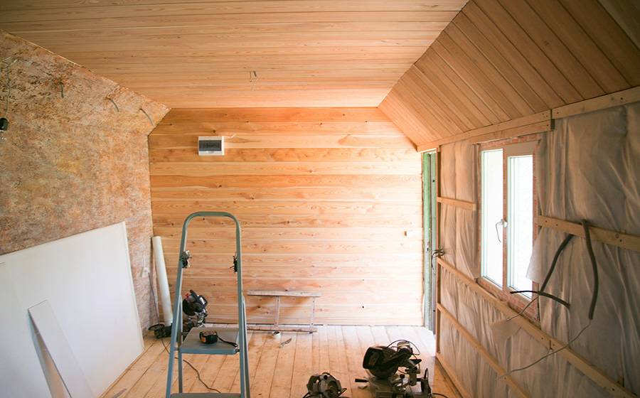 Монтаж обшивочного материала начинается с потолка. При обшивке стен может быть использован вертикальный или горизонтальный тип установки. В первом случае монтаж вагонки начинается с угла. При горизонтальной укладке доски монтируются «шипом» вверх, чтобы между панелями не скапливался конденсат.