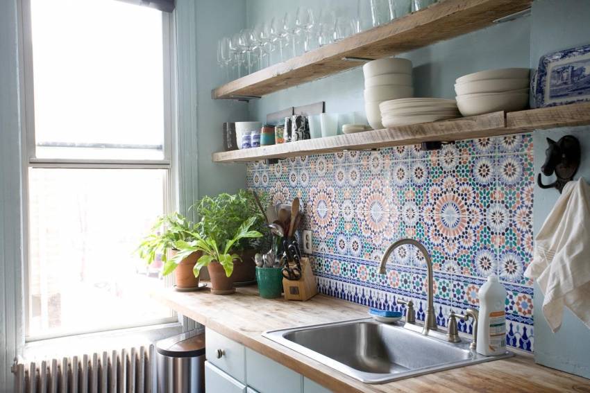 При оформлении фартука кухни с открытыми полками следует использовать плитку с интересным орнаментом или формой