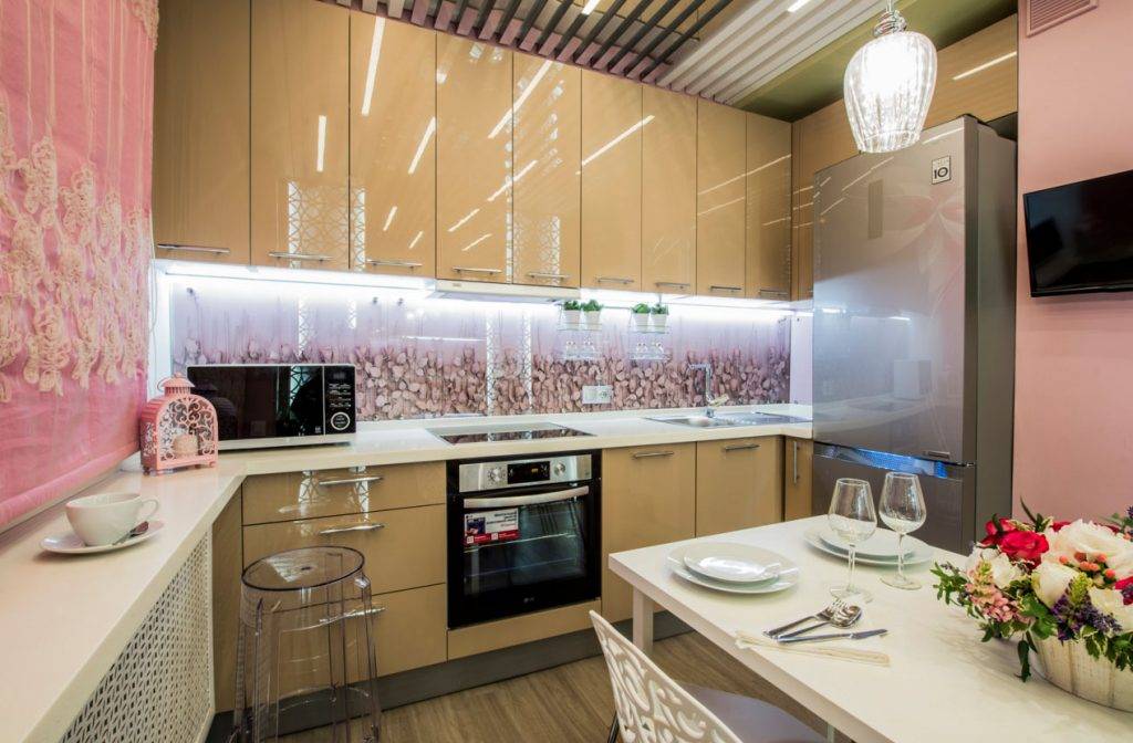 Стеклянные панели, или, как их еще называют, скинели (от английского слова «обшивать») стали популярны благодаря разнообразию дизайна. Любые рисунки в любом цвете, в том числе объемные, можно перенести на этот вид покрытия. С помощью стеклянных панелей помещение быстро обновляется и преображается, наполняясь яркими красками. Для небольшой кухни панели из стекла — идеальное решение, ведь они визуально увеличивают пространство.