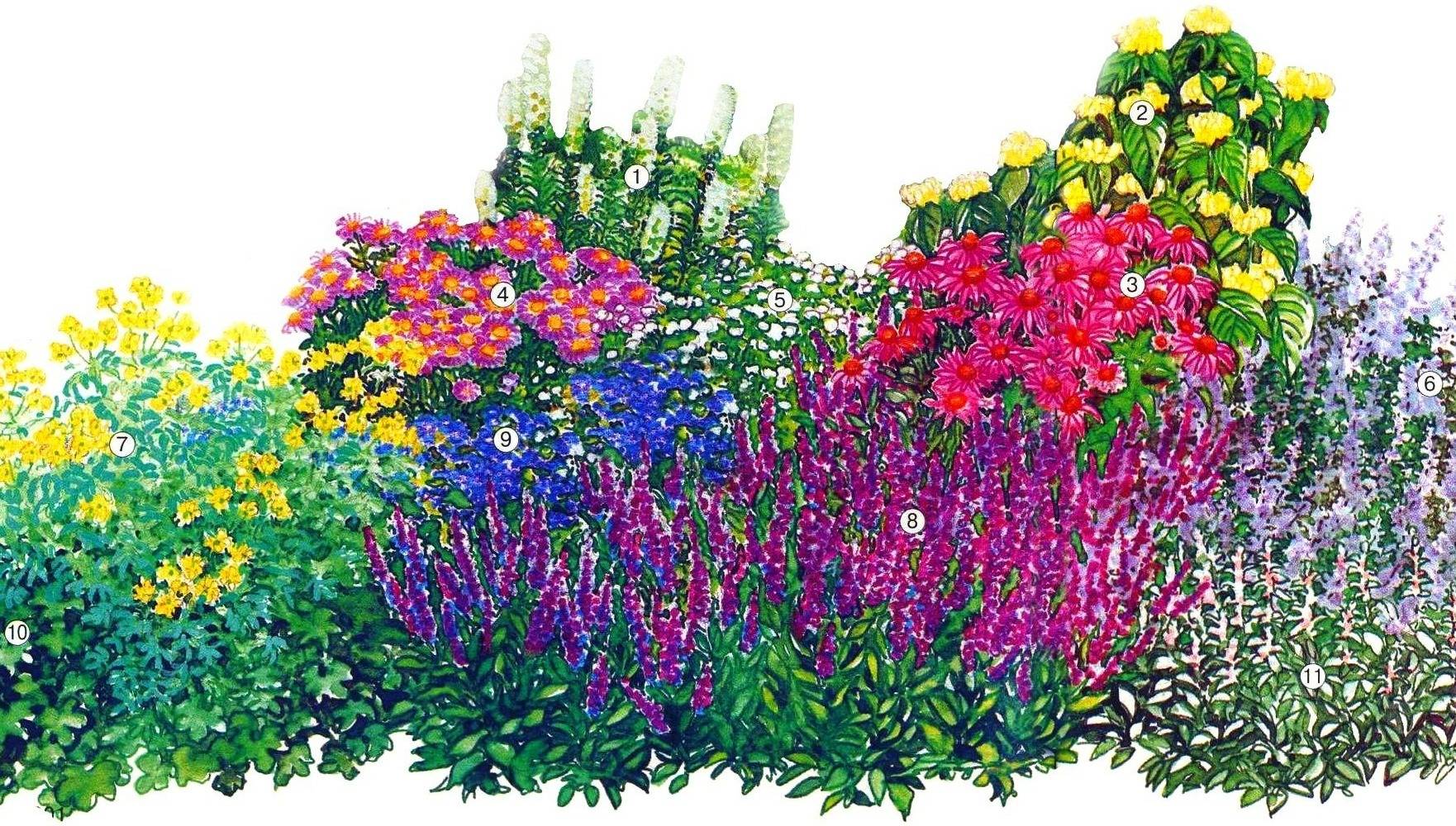 Основное правило создания миксбордера заключается в том, что растения высаживаются «по росту». На переднем плане цветника размещаются низкорослые цветы, за ними располагаются представители фауны средней высоты, а в самом конце высаживаются наиболее высокие растения.