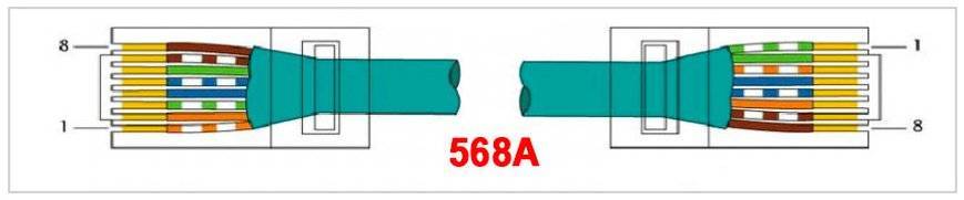 Для подключения концентратора, маршрутизатора или коммутатора к компьютеру требуется прямое соединение. Этот метод более популярен в России. Он обозначен в виде 568 В и разводка ведется по обычной схеме, начиная с бело-оранжевого проводника и заканчивая коричневым. Обжим здесь прямой, так как провода на обоих разъемах расположены одинаково.