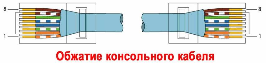 Каждый конец в этом соединении обжимается и зеркально отражается друг от друга. Эта схема используется для настройки коммутатора или маршрутизатора с помощью компьютера.