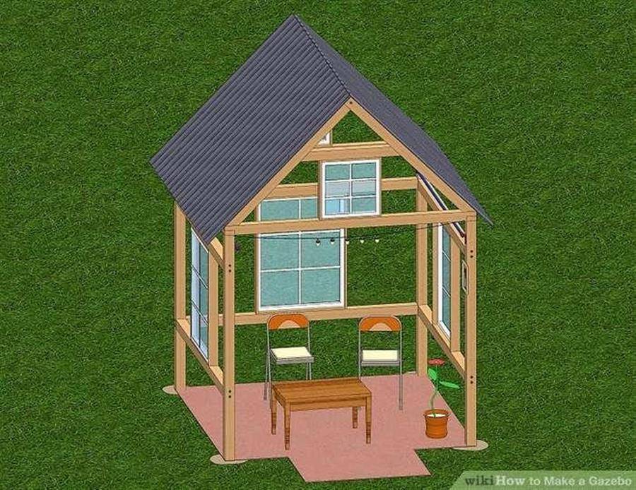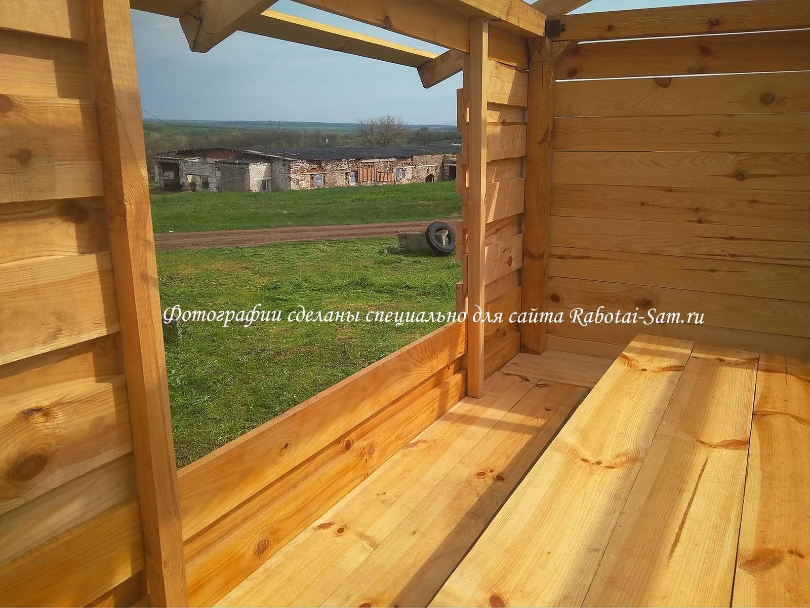 Простейшая дешевая беседка своими руками готова. При желании можно закрепить перила, поставить решетку или тонкие стенки. Для этого потребуется поставить дополнительные столбы в центре каждой стены, чтобы перегородки не упали.
