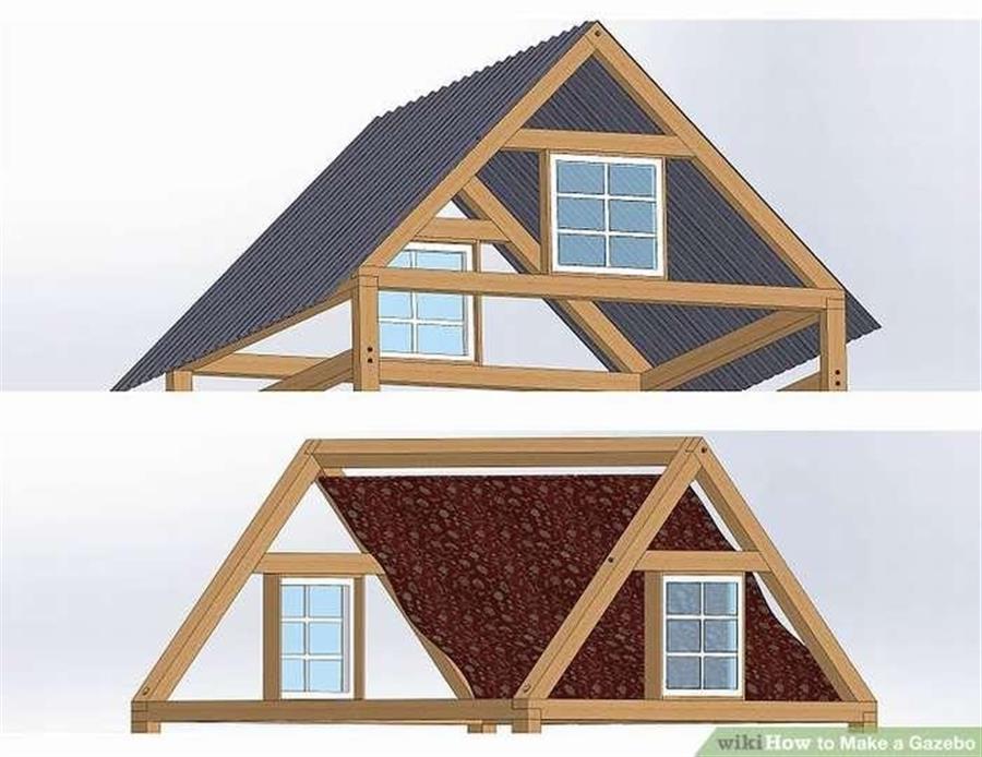 Беседка своими руками из дерева должна обладать такой же крышей, что и жилой дом. Наиболее приятно на беседках смотрятся многоскатные крыши, однако из-за сложности монтажа их используются редко. Односкатные крыши не менее привлекательны, но обладают куда меньшими требованиями к установке.