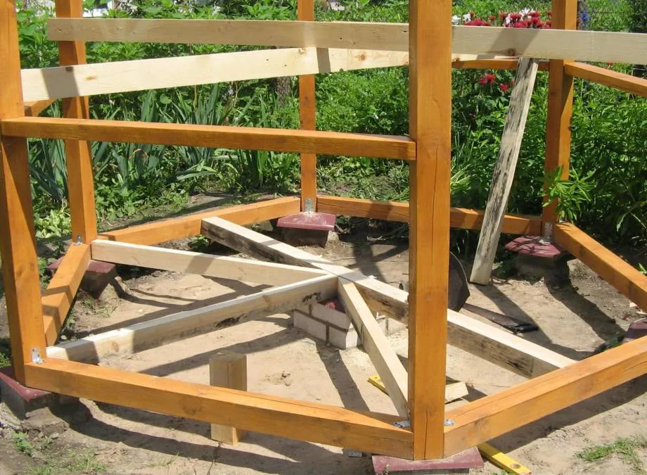 рассмотрим, как сделать деревянный пол в беседке из дерева.
