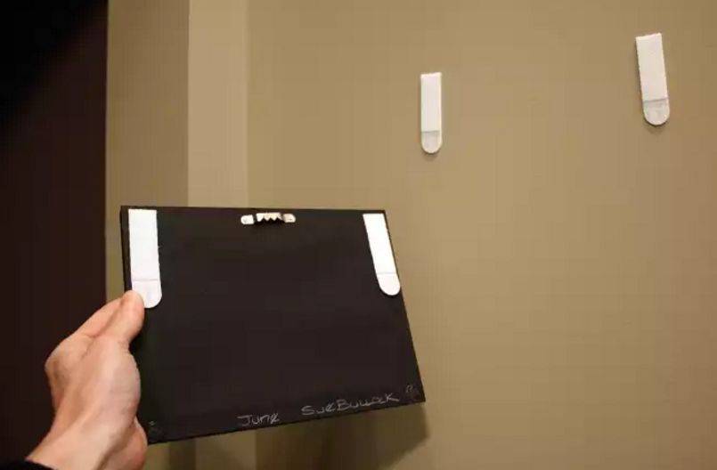 Особые липучки, называемые устройством Command напоминают двусторонний скотч. Но только они двусоставные — на одной части липкий состав на клею, а противоположная с липучкой. Одна присоединяется к стене, а другая фиксируется на раме.