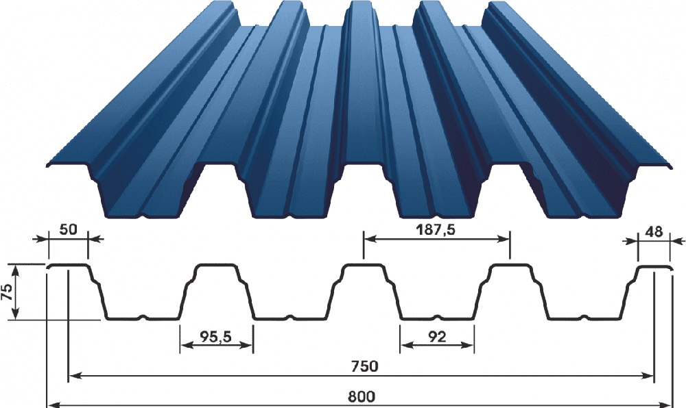 Для плоской крыши применяют профлисты повышенной прочности с высотой профиля не ниже 75 мм.