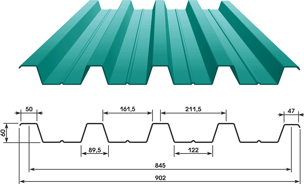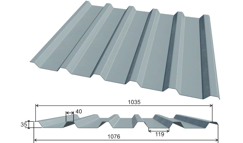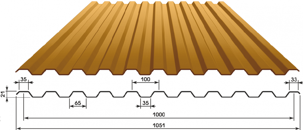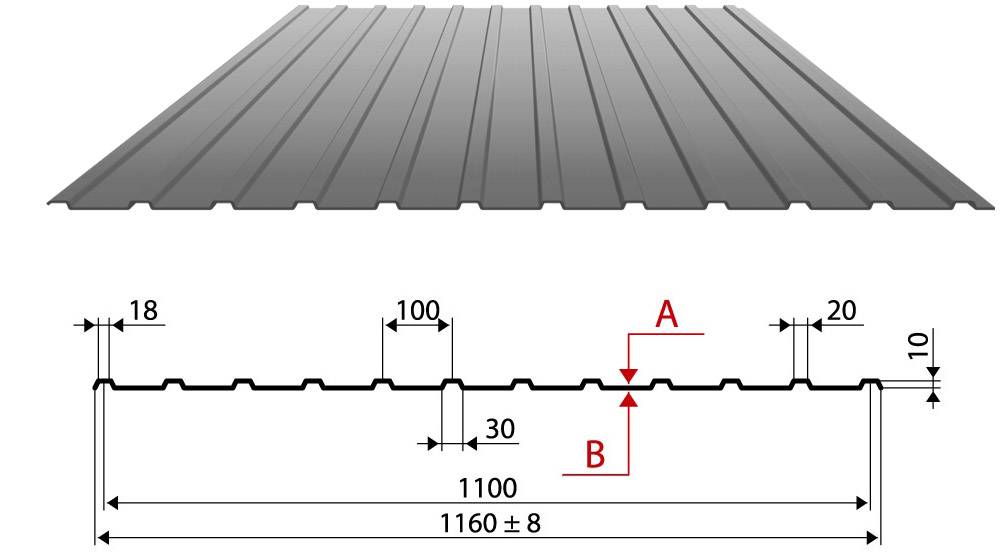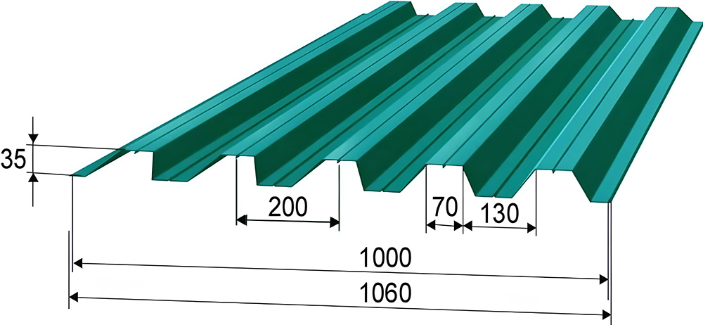 Используется для покрытия кровли из профнастила своими руками, а также фасадов и заборных ограждений. Заготовки имеют габаритную ширину 1,76 метра, полезную ширину — 1,35 метра, высоту профиля в три с половиной миллиметра, толщину стали — от 0,45 до 0,9 миллиметров.