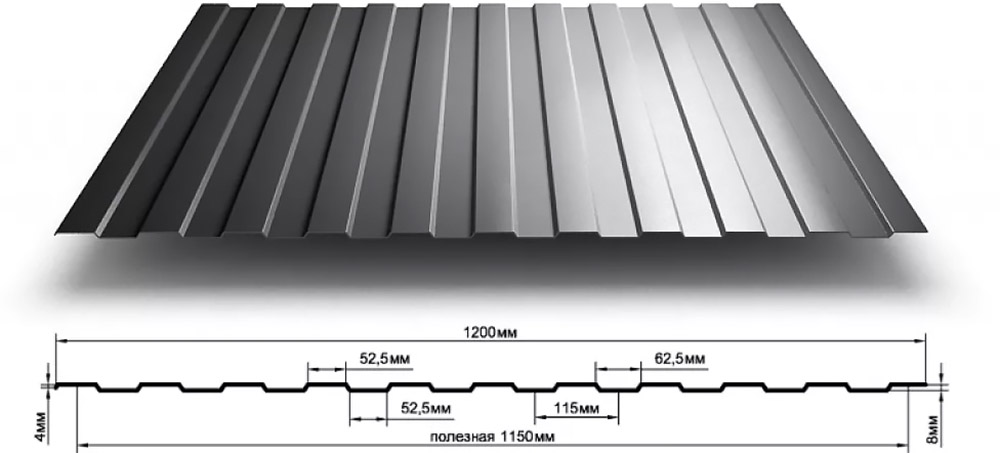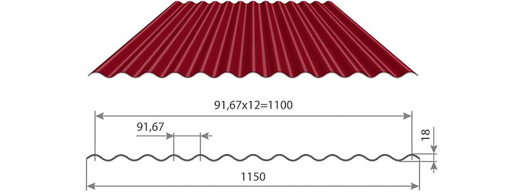 Используется для кровель, фасадов и заборных ограждений. Заготовки имеют габаритную ширину 1,15 метра, полезную ширину — 1,1 метра, высоту профиля — 1,8 миллиметра, толщину стали — от 0,4 до 0,8 миллиметров.
