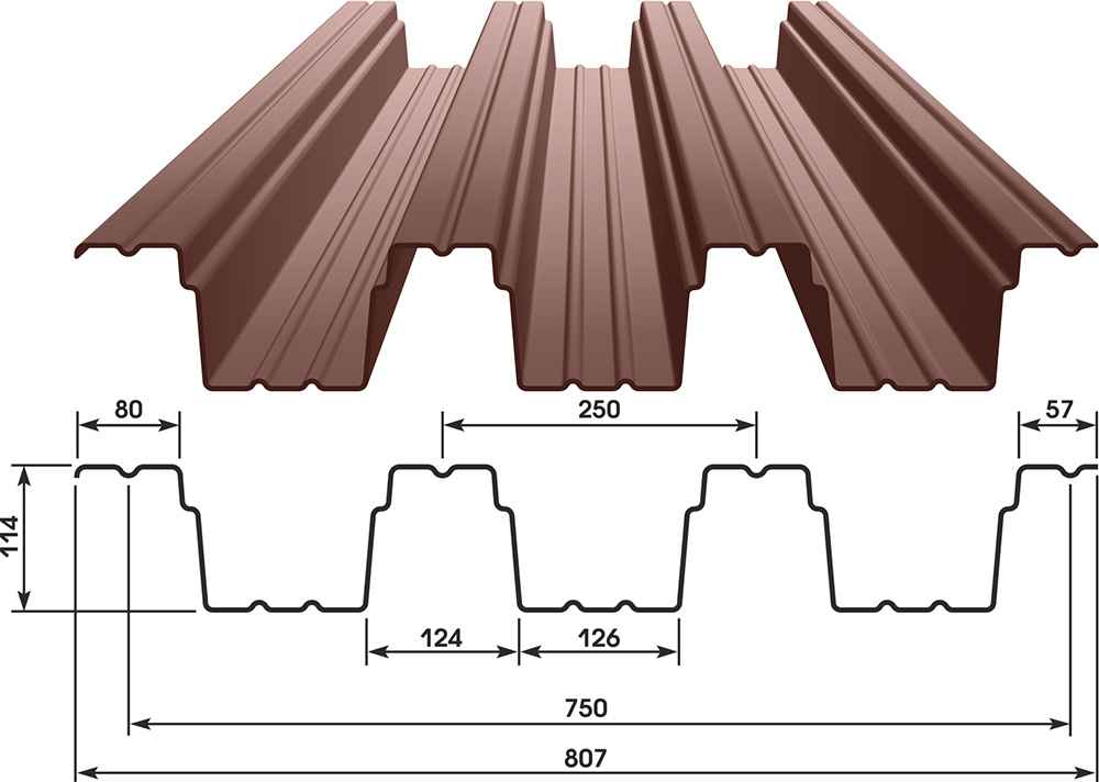 Рекомендации к использованию на кровлях, несущих конструкциях и несъёмных опалубках. Заготовки имеют габаритную ширину 80,7 или 64,6 см, полезную ширину — 75 или 60 сантиметров, высоту профиля — 11,4 сантиметров, толщину стали — от 0,7 до одного миллиметра.