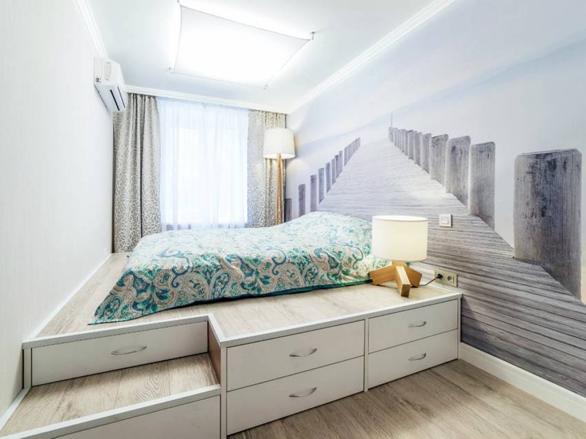 С помощью кровати-подиума можно зонировать пространство в небольшой комнате