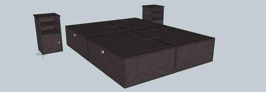 Если подобные работы никогда не выполняли, то двуспальную кровать лучше всего разместить на подиуме, изготовленном из ламинированного ДСП. Смастерить его несложно, с работой справится любой начинающий мастер. Не стоит ломать голову над устройством выдвигающихся элементов и подъемных частей – в подиуме свободное пространство уже предусмотрено.