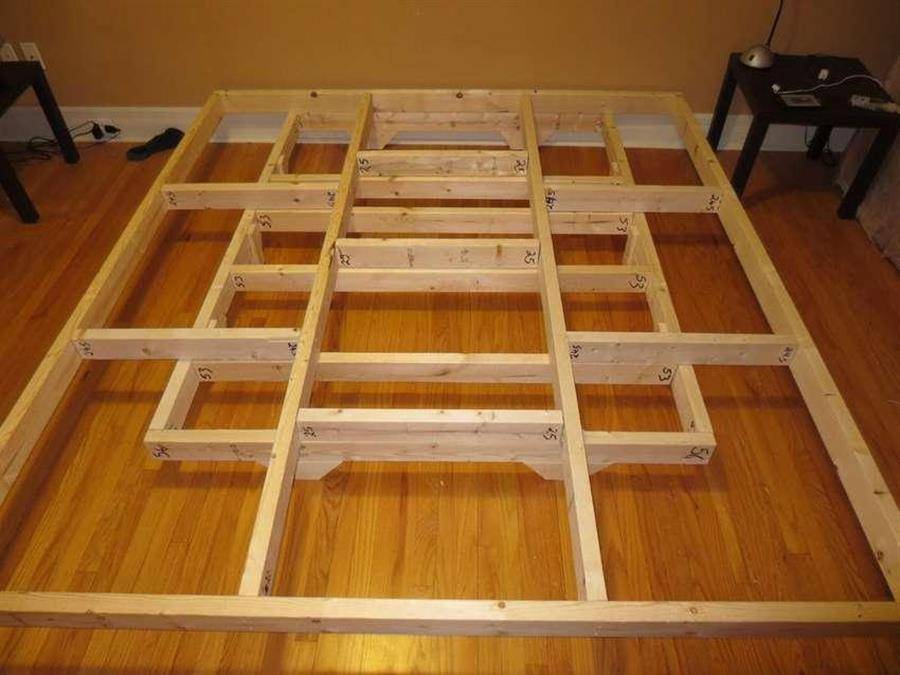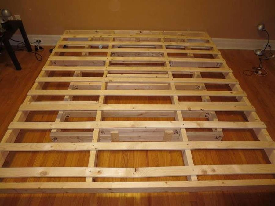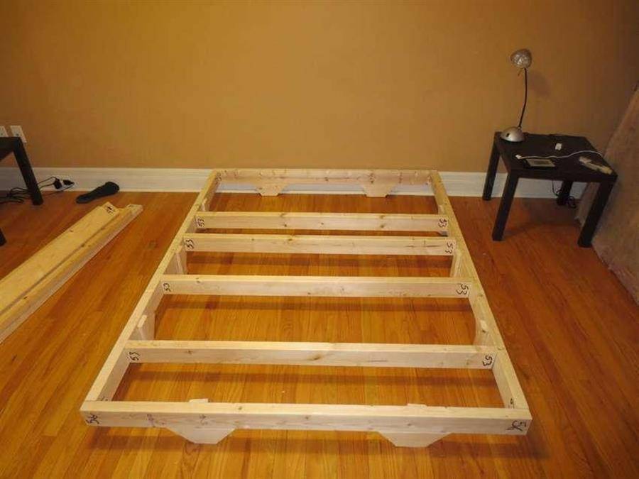 Прикрепите планки 2×4 к ножкам 4×4 шурупами. Установите боковые направляющие на планки и прикрепите с помощью клея и гвоздей. Также рекомендуется крепление с помощью L-образного и прямого кронштейна сверху. Положите рейки в каркас кровати, равномерно расположив их. Прикрутите шурупами или забейте гвоздями.