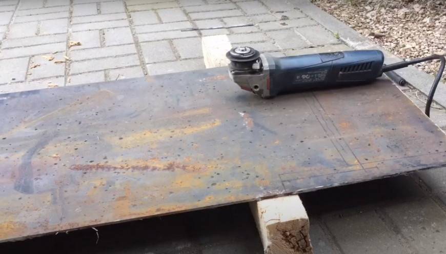 - Обрезаем металлический лист под нужные размеры при помощи болгарки.
