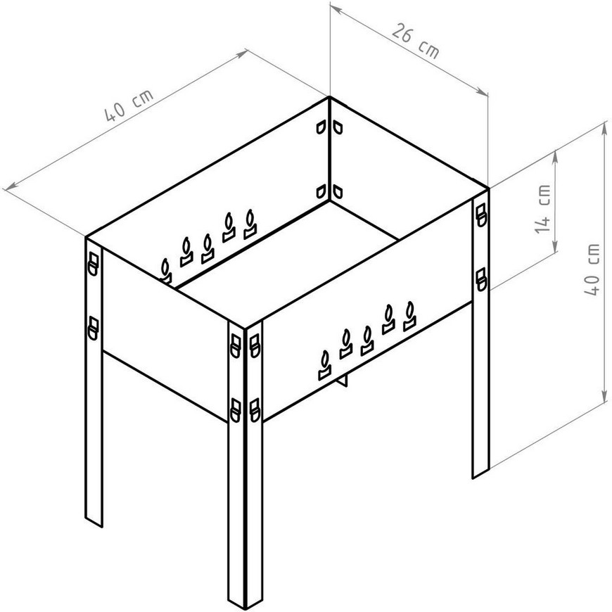 Простой мангал разборный изготавливается в среднем на 10 шампуров. Конструкция будет собрана за счет создания пазов и крепежей, что исключает проведение сварочных работ. Оптимальные размеры жаровни: 280 мм х350 мм х240 мм. Глубину мангала можно сделать в пределах 150-180 мм.