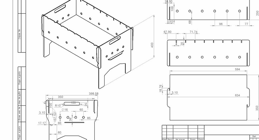 Разборный мангал имеет чертеж с размерами и детальной инструкцией, где нужно сверлить отверстия, и как соединять между собой отдельные части печи.