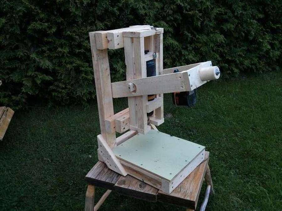 Конечный результат и функциональность станка можно просмотреть по предоставленному видео. В качестве электропривода подойдет практически любая ручная дрель вне зависимости от мощности. По данной схеме можно изготавливать станки разных размеров и производительности. Готовое устройство является бюджетной и простой альтернативой брендовым видам оборудования.