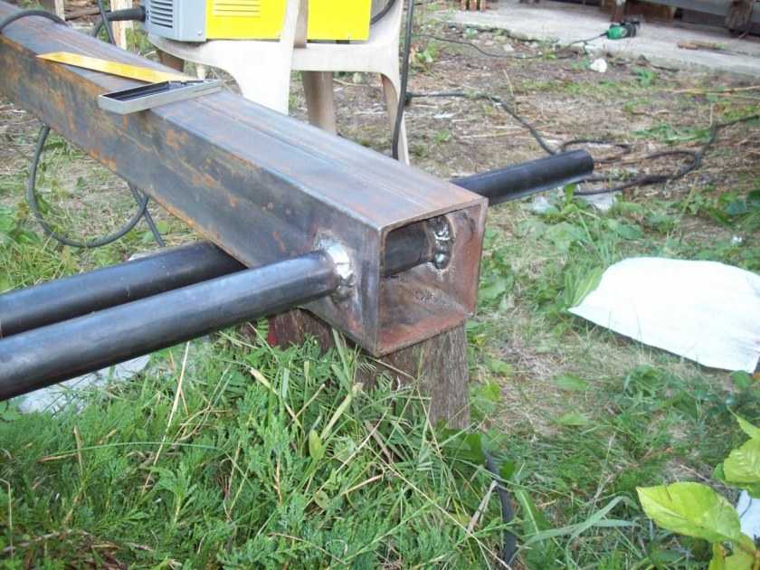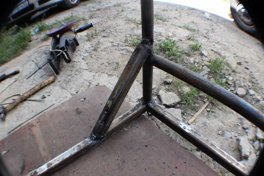 На схеме нет угловых упоров, они сделаны «на глаз». Угол — около 50°. Далее дело за малым — сварить. При помощи инверторного сварочного аппарата это не слишком сложно. Тем более что труба имеет толстую стенку: 3 мм варится нормально.
