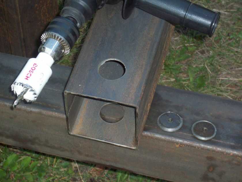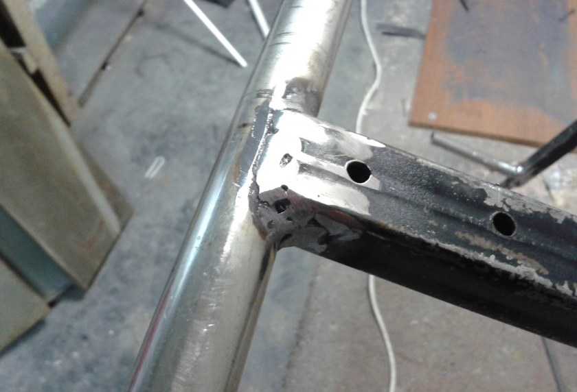 Для плотного примыкания круглой трубы и прямоугольной, в стойке болгаркой выпилен полукруг. Пришлось дорабатывать напильником, но прилегание очень хорошее. Осталось обварить.