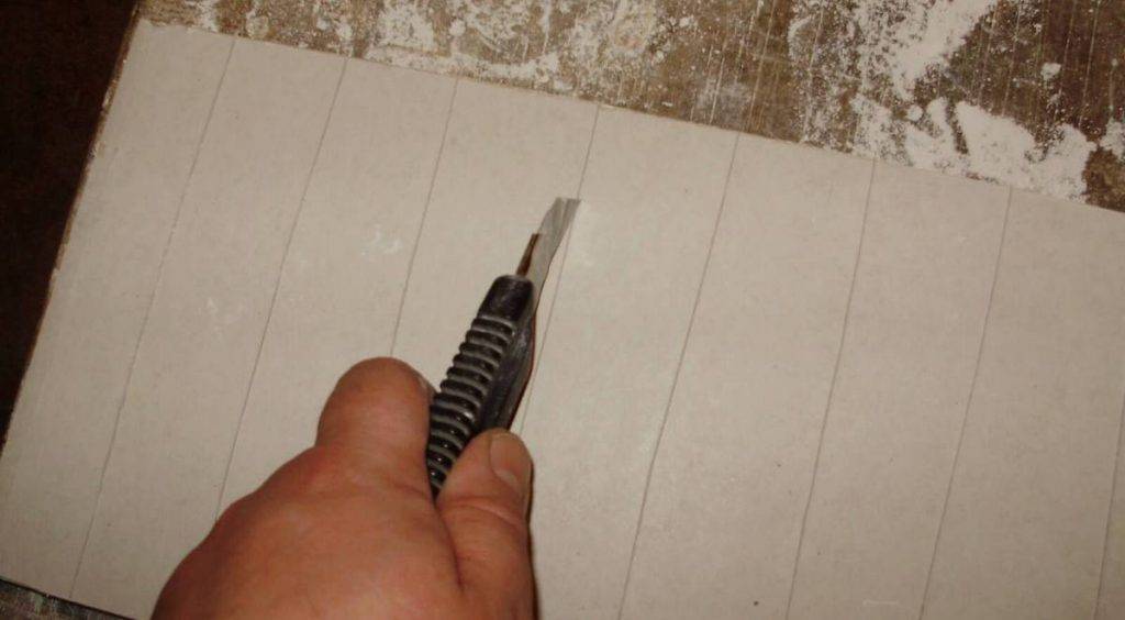 - По линиям разметки вырезается фаска в виде буквы «V» так что нижнее ребро фаски доходит до картона с обратной стороны, но не разрезает его. Выполнить это можно с помощью специализированного устройства, которое фрезой вырезает фаску, или же ручным инструментом.