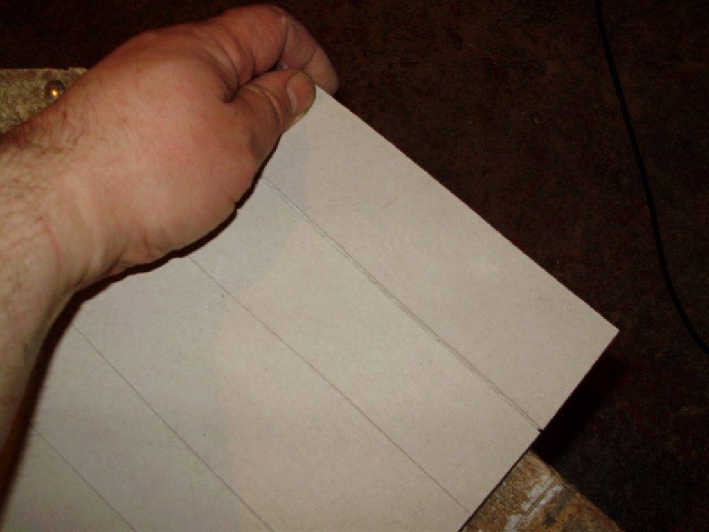 - Лист выкладывается на ровную прочную поверхность изнаночной стороной наверх. На нем отмечаются прямые линии, по которым будет выполняться изгиб. Минимальное расстояние между линиями может составлять 7 см.