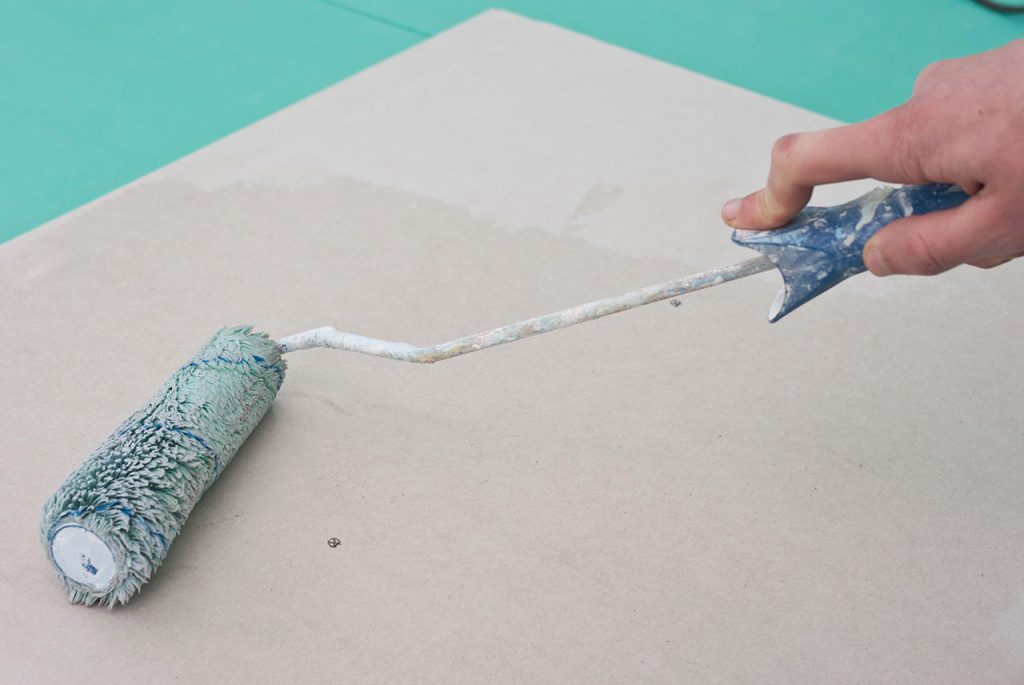 Перед замачиванием гипсокартон обрабатывают шипованым валиком