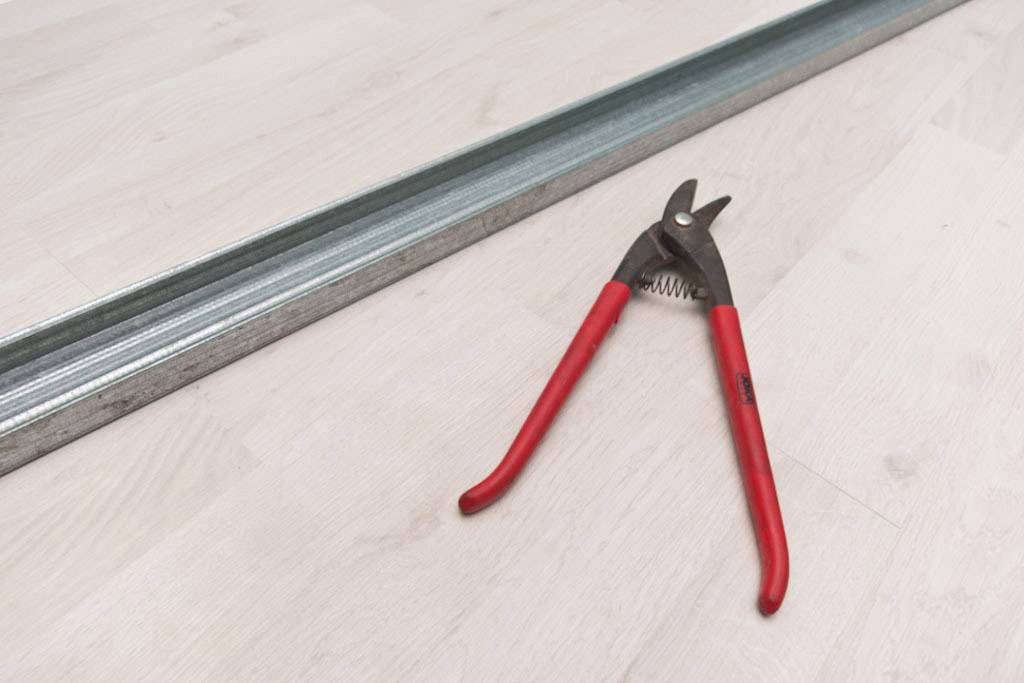 Для начала выберите несущий и направляющие металлические профили подходящего для ваших целей размера. Используя острые ножницы по металлу, отрежьте профиль необходимой длины.