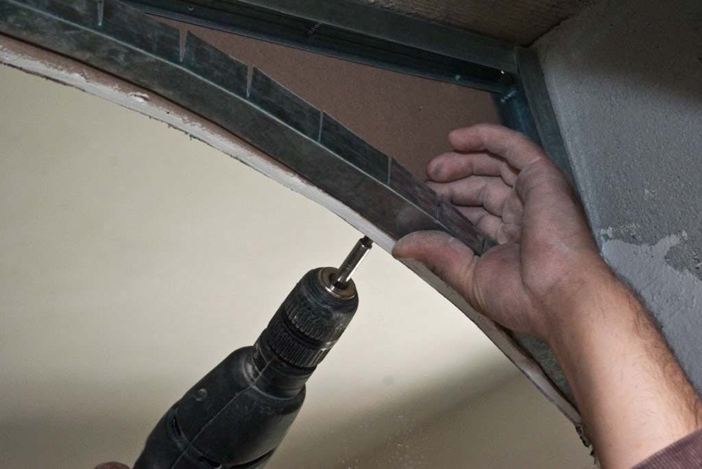 Если вы делаете дверную арку, прикрепите изогнутый направляющий профиль к уже размещенной на своем месте гипсокартоновой стенке. Используйте для этого саморезы для гипсокартона (для гипсокартона толщиной 12.5 мм лучшим выбором будут саморезы 3.5х41, а для гипсокартона толщиной 9.5 мм вполне подойдут крепеж поменьше).