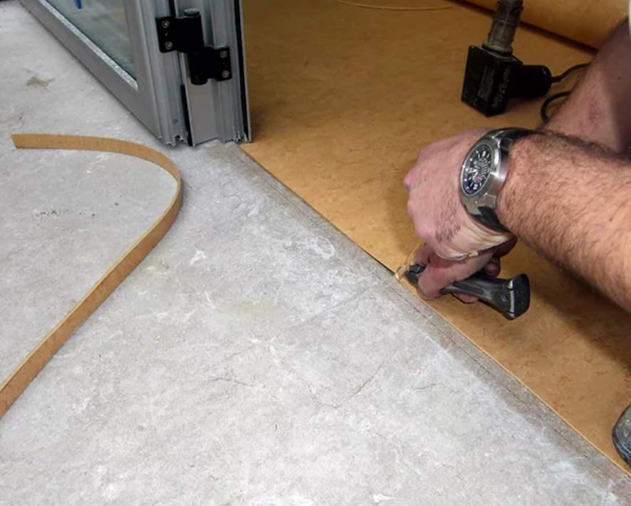 Довольно часто приходится укладывать на пол два (или больше) куска линолеума, так как ширины одного не хватает от стены до стены комнаты. Скрепляют напольное покрытие методом холодной сварки. Если линолеум изначально имеет неровные края, то не получится сделать шов незаметным. Чтобы выйти из положения, рекомендуется отступить от края полотна 1-2 сантиметра и сделать идеальный рез, выравнивающий кромку.