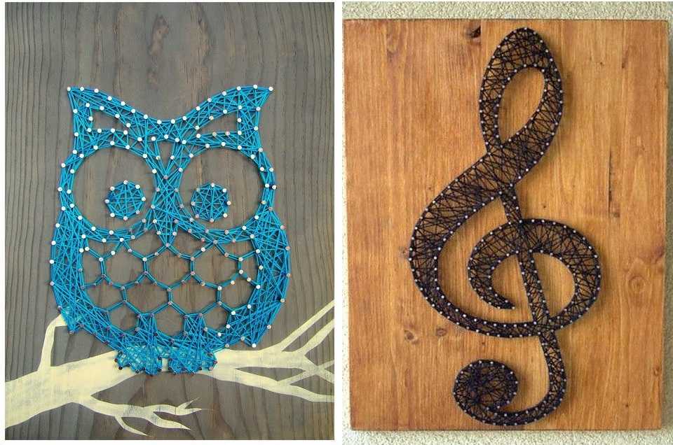 Не знаете как украсить стену оригинально? Можно сделать очень интересные вещи из ниток. Берут какую-то основу — деревянную доску, например, на ней гвоздиками набивают силуэт.