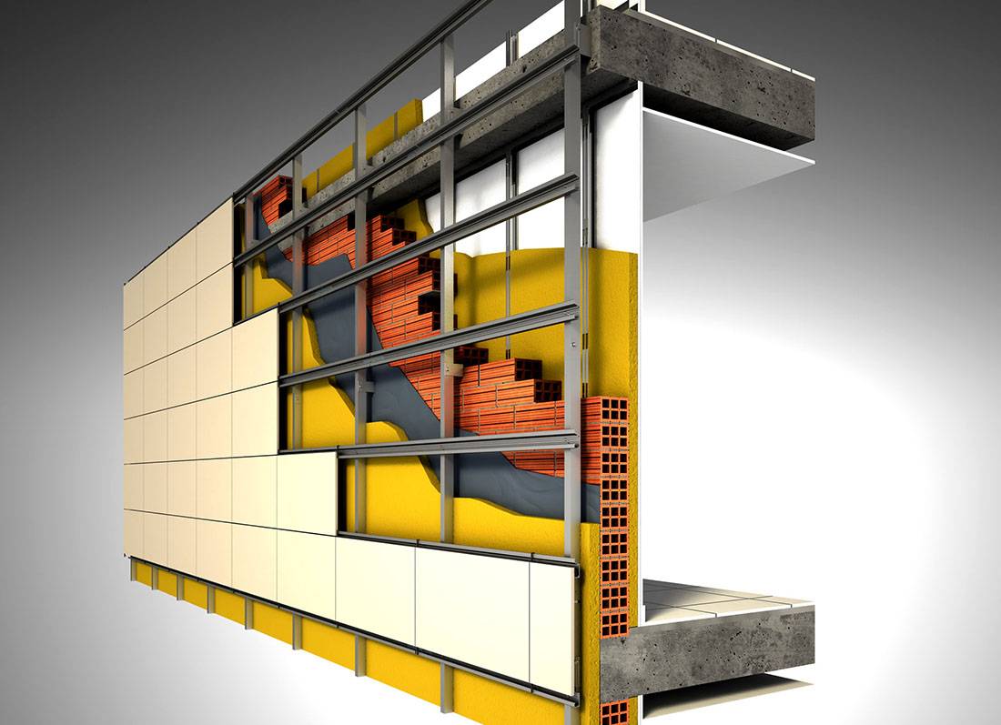 Это многослойная конструкция, монтируемая на наружные стены здания. Ее особенность — наличие воздушного зазора, обеспечивающего естественную вентиляцию утеплителя.
