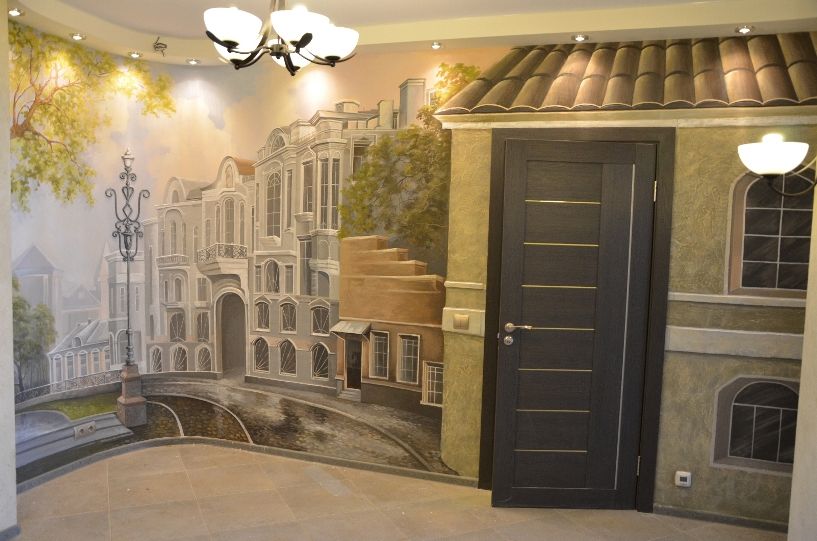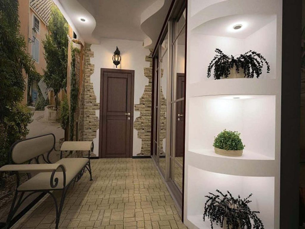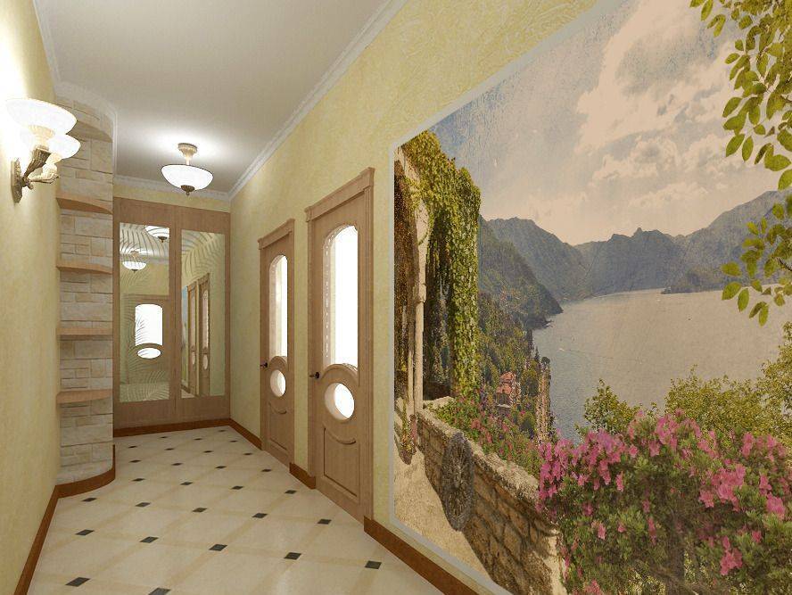 Для длинных и узких пространств применяют трехмерные изображения водопадов, городских улиц или бескрайних полей. Освещение необходимо использовать точечное, настенное, желательны геометрические рисунки, расположенные поперек длины коридора.