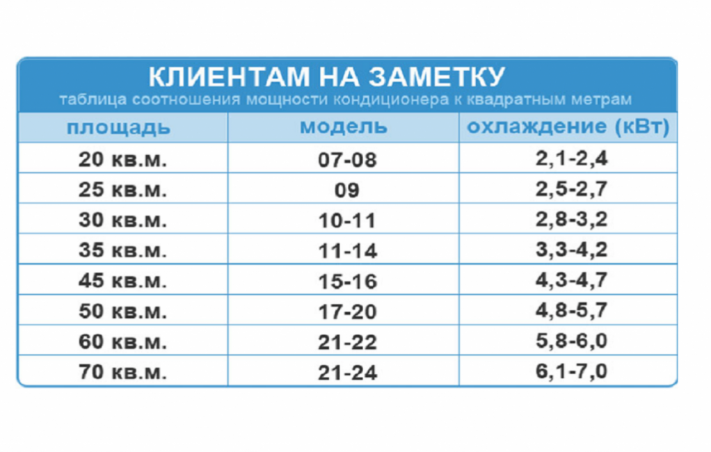 Далее, найдите в таблице рекомендаций площадь, соответствующую вашему помещению. В таблице указаны рекомендации по мощности кондиционера в киловаттах (кВт) или в тысячах калорий (ккал/ч).
