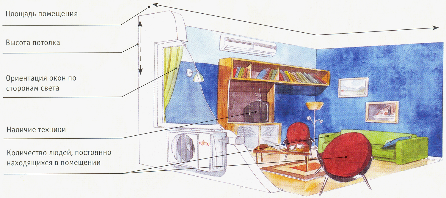 Также очень важно рассчитать площадь помещения, после чего убедиться в том, что кондиционер сможет её захватить. Успешность выбора зависит от следующих критериев: