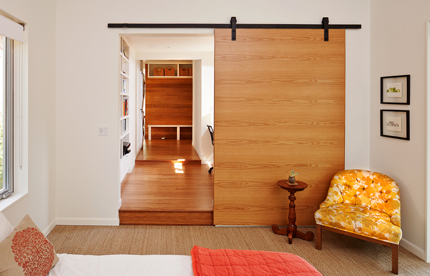 Раздвижные двери в интерьере удобны и практичны. Выбрать их можно для квартира небольшой площади. Поставить полотно нужно по направляющим относительно стены, а движение их обеспечивается за счет перемещения на роликах. Устанавливать раздвижную конструкцию рекомендуется для разделения одного помещения на отдельные участки.