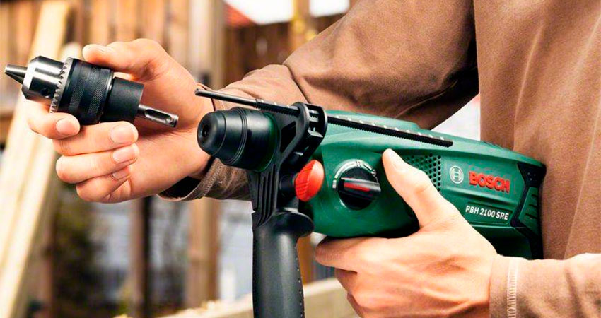 Стандартный перфоратор обладает тремя режимами работы – сверление, сверление с ударом и удар. Некоторые недорогие и маломощные модели не имеют функции удара.