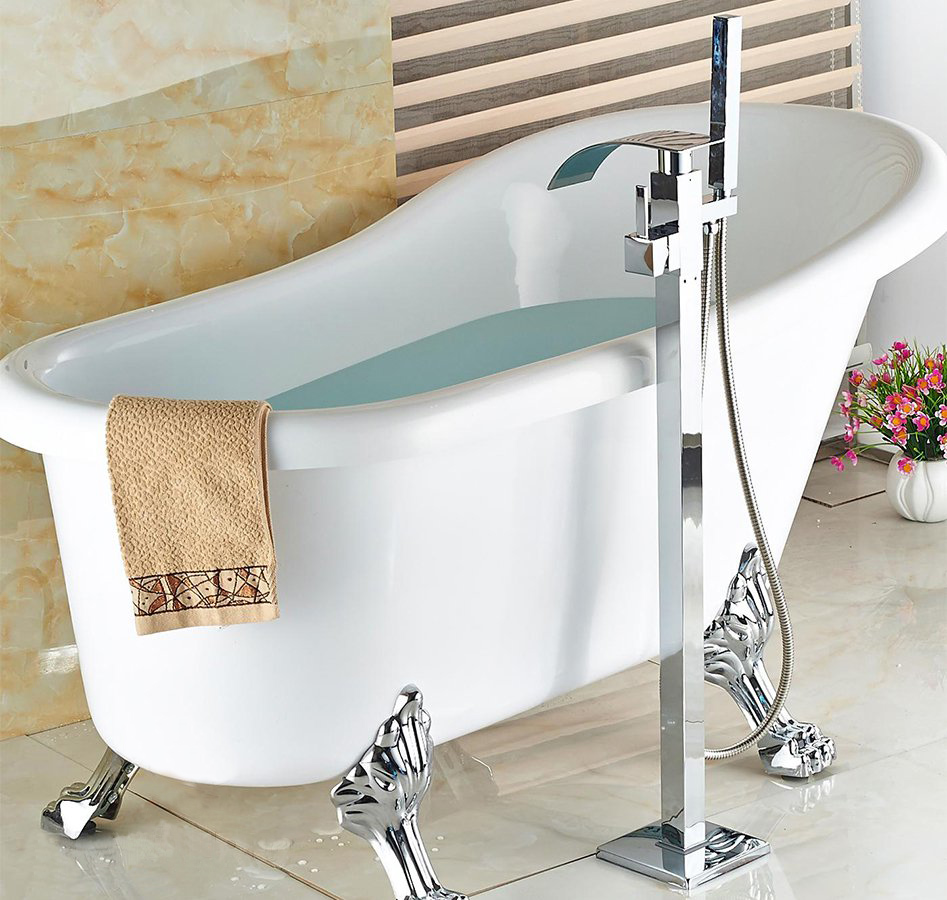 Для отдельно стоящих ванн нередко выбирают напольные приборы, представляющие собой колонну с изливом и ручным душем.
