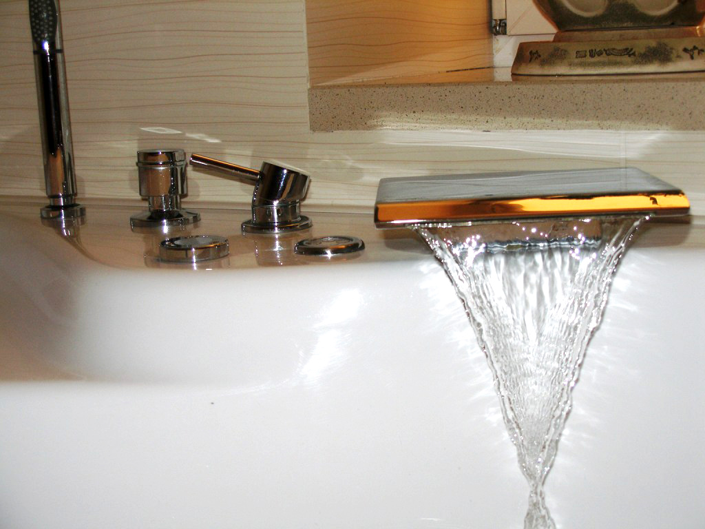 - Каскадный. Смеситель «водопад» имеет широкую площадь излива, шириной до 30 см. Как правило, отличается изысканным дизайном, может быть выполнен с использованием различных материалов. Чаще устанавливается на борт ванной или раковины, могут быть душевыми.