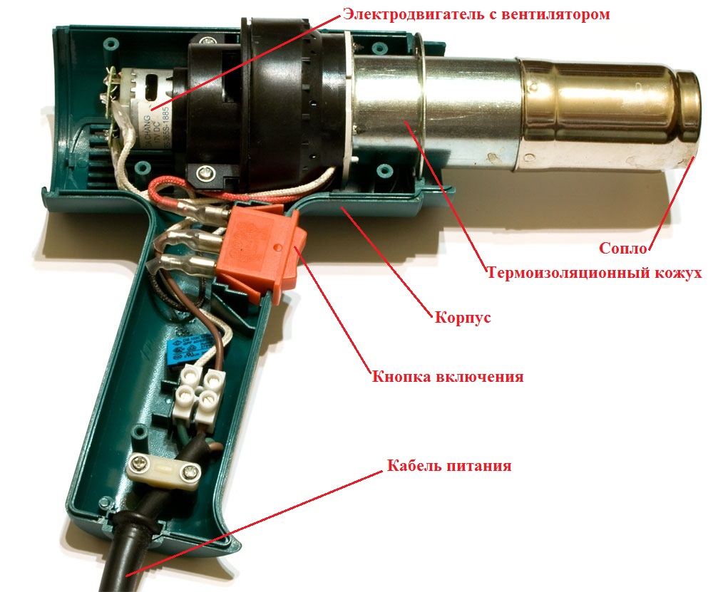 Основа технического фена – корпус, в котором находится электрический двигатель с вентилятором, который нагнетает горячий воздух в кожух термоизоляции. Кожух конструктивно заканчивается соплом, через который и выдувается нагретый воздух.