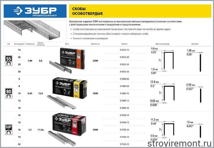 Тип скоб, который подходит к определенному инструменту, указан на упаковке, в инструкции, а также на самом корпусе степлера. Скобы различаются формой (п-образная или полукруглой формы), размерами (высота, ширина, толщина в мм) и типу заточки (заточенные или не заточенные концы).
