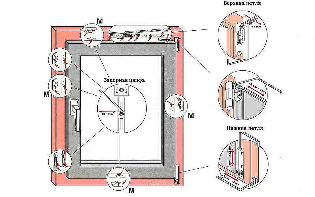 Регулировка окон и подгонка производится в случае больших зазоров или при ее цеплянии за раму. Отрегулировать открывающуюся створку по вертикали и горизонтали необходимо в случаях:
