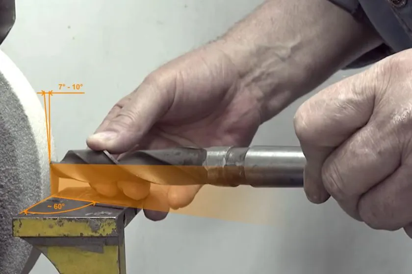 Первая задача – сделать задние поверхности ровными и с одинаковым наклоном. Чтобы правильно ориентировать сверло при заточке, на подручнике абразивного круга нанесите маркером черту под углом к рабочей поверхности круга, соответствующим углу между режущей кромкой и осью сверла (половина угла при вершине). В домашних условиях обычно упрощают задачу и располагают сверло под углом 60°.