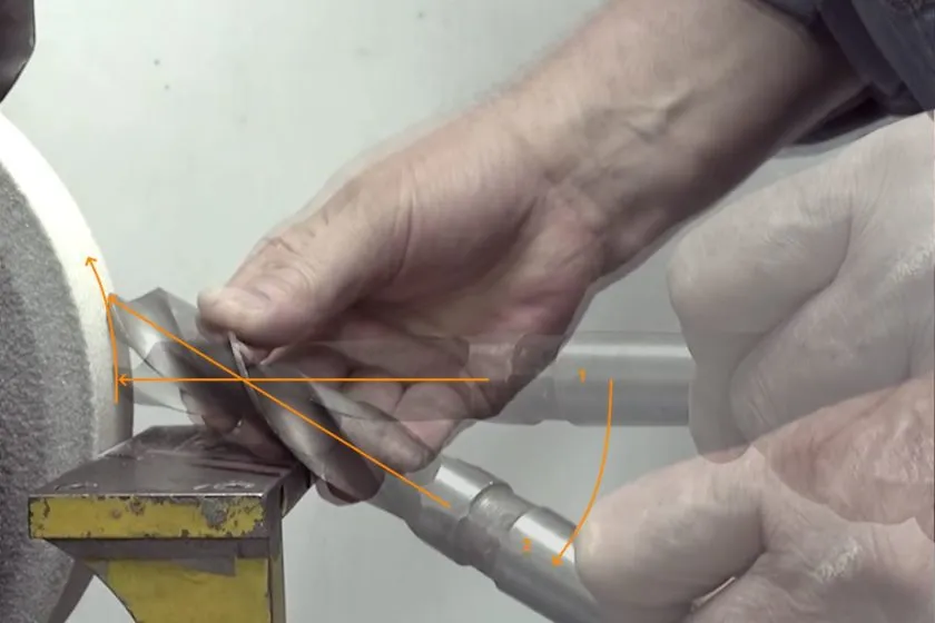 - Отведите сверло назад от круга, переверните его другой режущей кромкой вперед и снова приложите к кругу в аналогичном положении. Повторите колебательное движение хвостовиком так, чтобы наждак снова повернулся. Отработайте это движение с поворотом наждака несколько раз, чтобы выполнять заточку сверла по металлу автоматически.