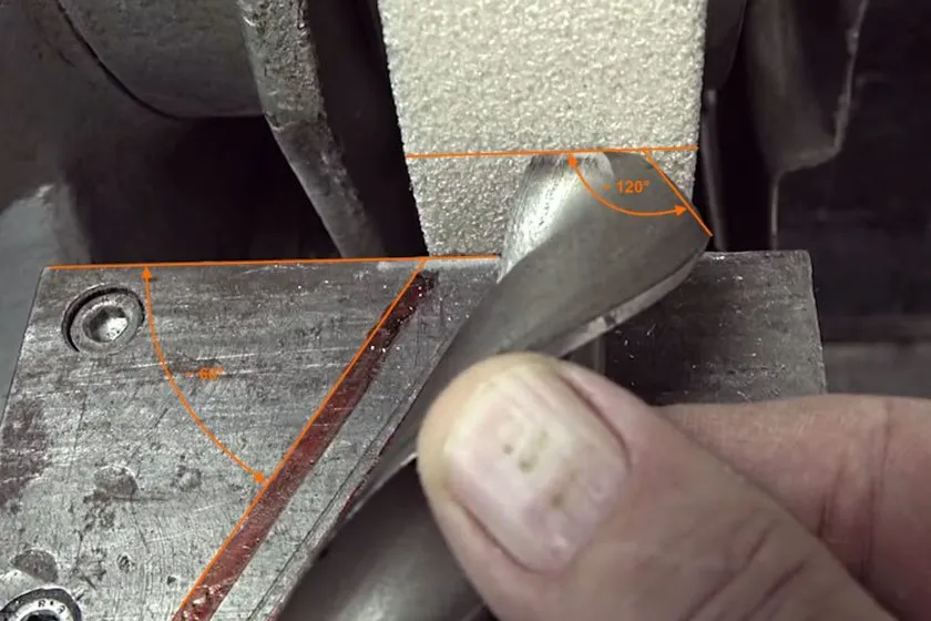 - Проработайте все действия с выключенным станком. Нарисуйте на подручнике линию под углом 60° к плоскости торца наждачного круга. Это позволит вывести угол при вершине в 120°.