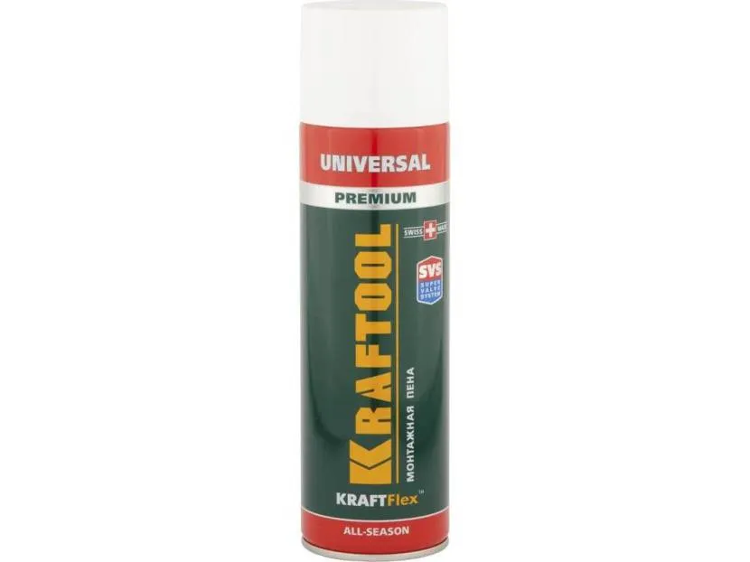 KRAFTOOL KRAFTFLEX PREMIUM – всесезонная пена для внутренних и наружных работ. Проявляется стойкость к огню, хорошие звукоизоляционные и теплоизоляционные свойства. На выходе из баллона в 750 мл получается около 45 литров вспененной массы.